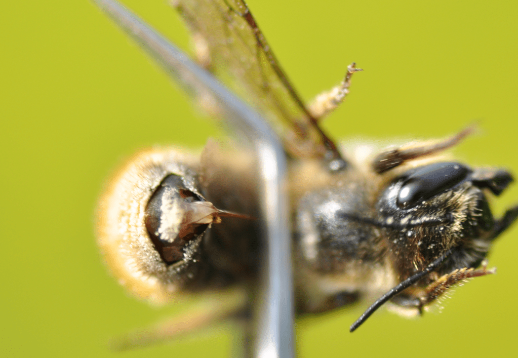 Posiadanie żądła nie oznacza jeszcze, że ze strony owada grozi nam użądlenie. W przypadku zdecydowanej większości pszczół ryzyko użądlenia człowieka jest minimalne, a czasem żadne. Większość dzikich pszczół nie broni swoich gniazd tak jak pszczoła miodna ula. Jeśli człowiek zbliży się do ich gniazda, a nawet jeśli zacznie je niszczyć (nie polecam), wybiorą ucieczkę, żeby ratować siebie. Żądło może pójść w ruch dopiero jeśli samica nie będzie mogła uciec, czyli np. zostanie złapana w rękę, przyciśnięta czy nadepnięta. Użądlenie dzikich pszczół zwykle nie jest zbyt bolesne, a żądło żadnego z polskich gatunków poza miodną nie zostaje w skórze. Co więcej, niektóre gatunki nie są w stanie przebić skóry człowieka, więc nie mogą użądlić w żadnych okolicznościach. To wszystko sprawia, że użądlenie przez pszczołę inną niż miodna zdarza się bardzo, bardzo rzadko. Dlatego zapewne rozpowszechniło się fałszywe przekonanie, że dzikie pszczoły nie mają żądeł. Szczególnie często słyszę to w odniesieniu do znanych i lubianych murarek ogrodowych. Otóż pszczoły te żądła mają, ale z nich nie korzystają, a w każdym razie nie w taki sposób.