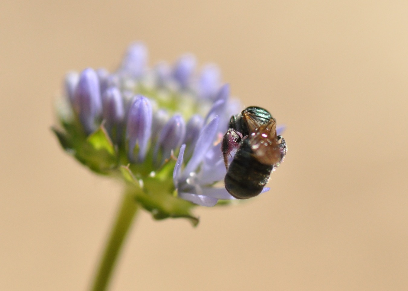 Rożyca błękitnawa, Ceratina cyanea, na jasieńcu. Zwróćcie uwagę na metaliczny połysk widoczny na tułowiu i na różowy pyłek w szczoteczce na tylnej nodze