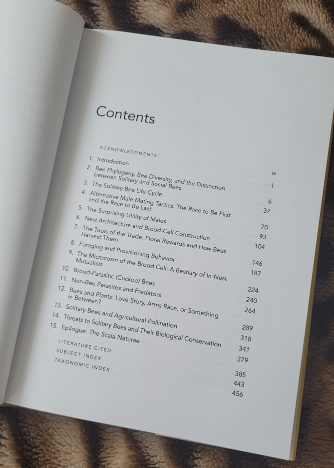 W „The Solitary Bees” omówione są wszystkie najważniejsze aspekty życia pszczół samotnic, a zasięg geograficzny obejmuje cały świat. Autorzy są ze Stanów Zjednoczonych, ale nie czuć w książce skupienia na amerykańskich pszczołach kosztem np. Europy. Są nawet cytowani polscy melitolodzy 🙂