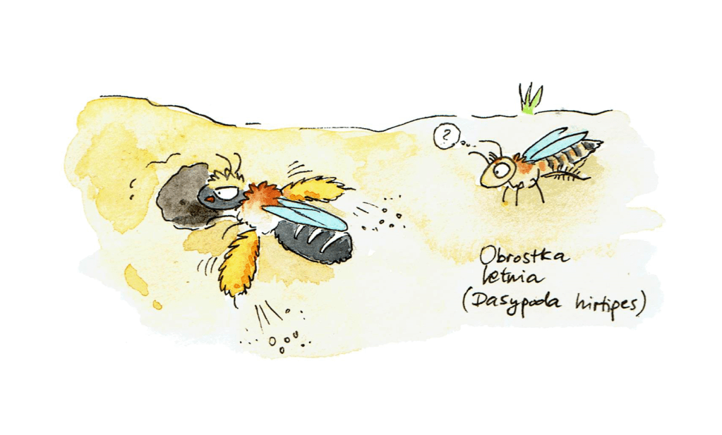 Obrostka letnia (Dasypoda hirtipes) to najczęściej spotykana spośród kilku naszych krajowych obrostek. Zarówno polska, jak i łacińska nazwa rodzajowa pochodzi od wyjątkowo obficie owłosionych tylnych nóg. Puste szczoteczki wyglądają okazalej niż wypełnione pyłkiem szczoteczki u niejednej innej pszczoły. Samce szczoteczek nie mają, a ich tylne nogi wyglądają jak, hmm… przerzedzony las. Z goleni sterczą im rzadkie, ale długie włosy.