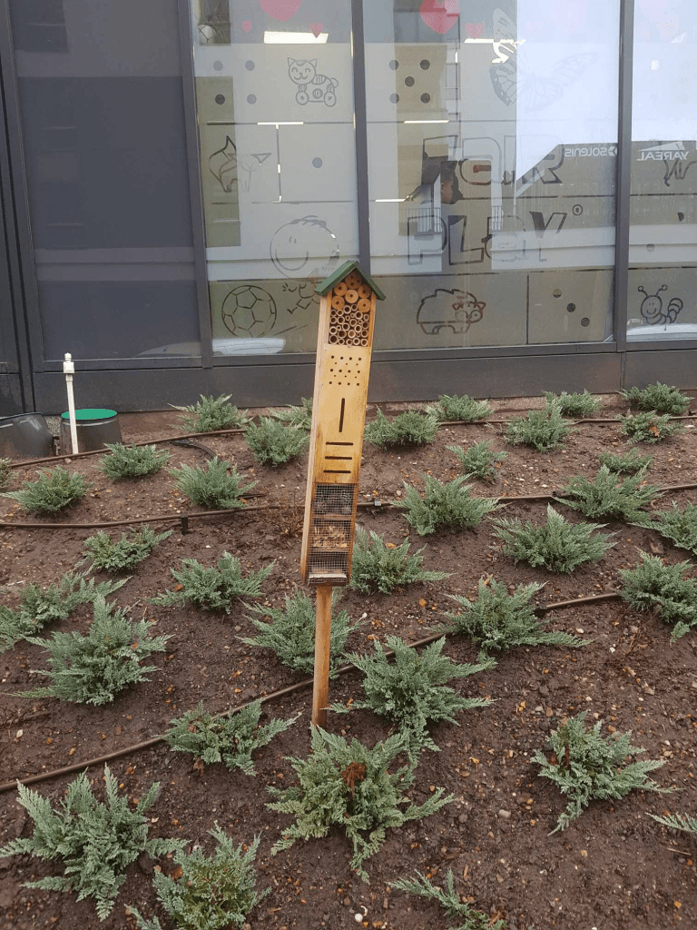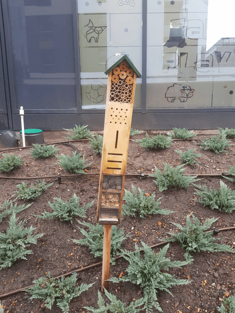 Ogólnie rzecz biorąc, nie jestem przeciwniczką hoteli dla owadów, ale przyznaję, że to trudny temat, a ich stawianie to aktywność dość ryzykowna – można popełnić naprawdę sporo błędów. Tutaj niestety zostały popełnione błędy wręcz kardynalne. Spójrzcie na otoczenie domków – czy oprócz tych nasadzonych krzaczków (czy ktoś wie, co to jest i czy to w ogóle zamierza w przyszłości kwitnąć?) i betonu widzicie gdzieś miejsce, do którego mieszkańcy tego domku mogliby latać po pyłek i nektar (w przypadku pszczół), ewentualnie drobne bezkręgowce (w przypadku bolic czy innych drapieżnych błonkówek)? Bo ja nie. Przypomnę, że dzikie pszczoły latają zazwyczaj do kilkuset metrów od gniazda, niektóre nawet mniej, a odległość powyżej kilometra jest osiągalna tylko dla niektórych gatunków i wiąże się z dużym wysiłkiem, a co za tym idzie – zmniejszoną produkcją potomstwa. Ktokolwiek postawił te domki, najwyraźniej zapomniał o zasadzie, że oprócz hotelu trzeba owadom zapewnić stołówkę w pobliżu, inaczej to wszystko jest bez sensu. To niestety nie jest odosobniony przykład tak tragicznego usytuowania hotelu dla owadów – widziałam (na żywo bądź na zdjęciach) hotel ustawiony na środku wykostkowanego miejskiego rynku czy na wysypanej zrębkami i obsadzonej tujami „wysepce” obok parkingu. No naprawdę, w budowie domków są o wiele bardziej skomplikowane rzeczy niż usytuowanie w odpowiednim miejscu (o jednej z nich niżej), a zadbanie o pokarm to podstawa podstaw! Emilia powiedziała mi, że niedaleko tych domków jest przedszkole. Może zostały postawione w ramach zorganizowanej przez nie akcji dbania o przyrodę? Smutno się robi, kiedy się pomyśli, jaką naukę wyniosły z tego przedszkolaki, bo na pewno nie dowiedziały się w ten sposób, jak prawidłowo dbać o owady.
