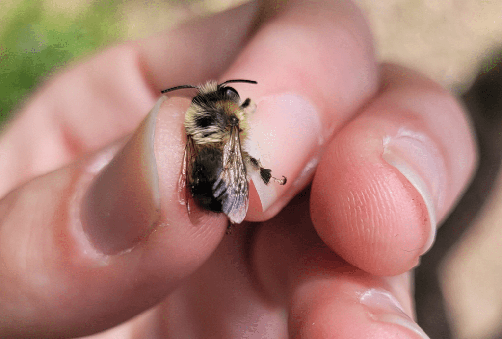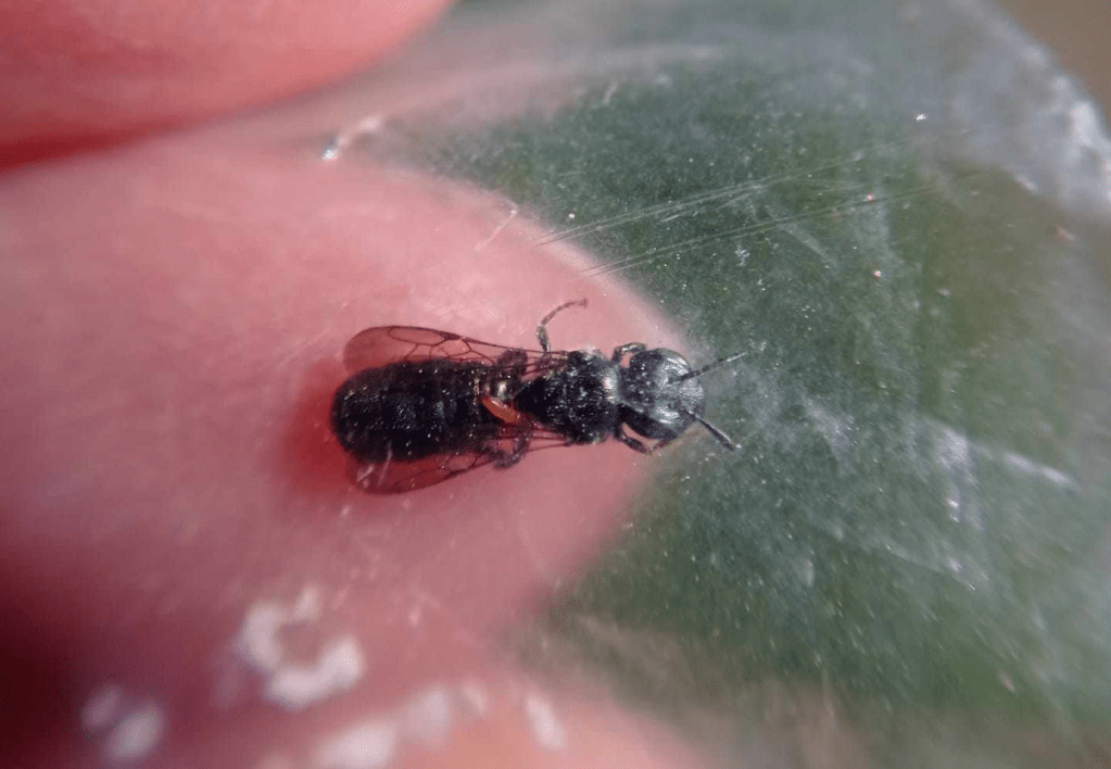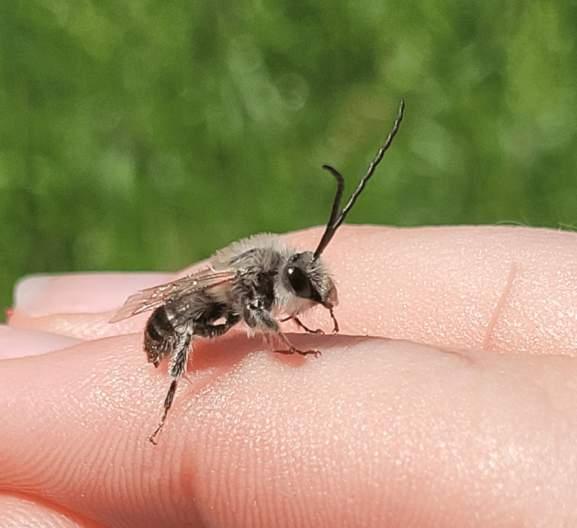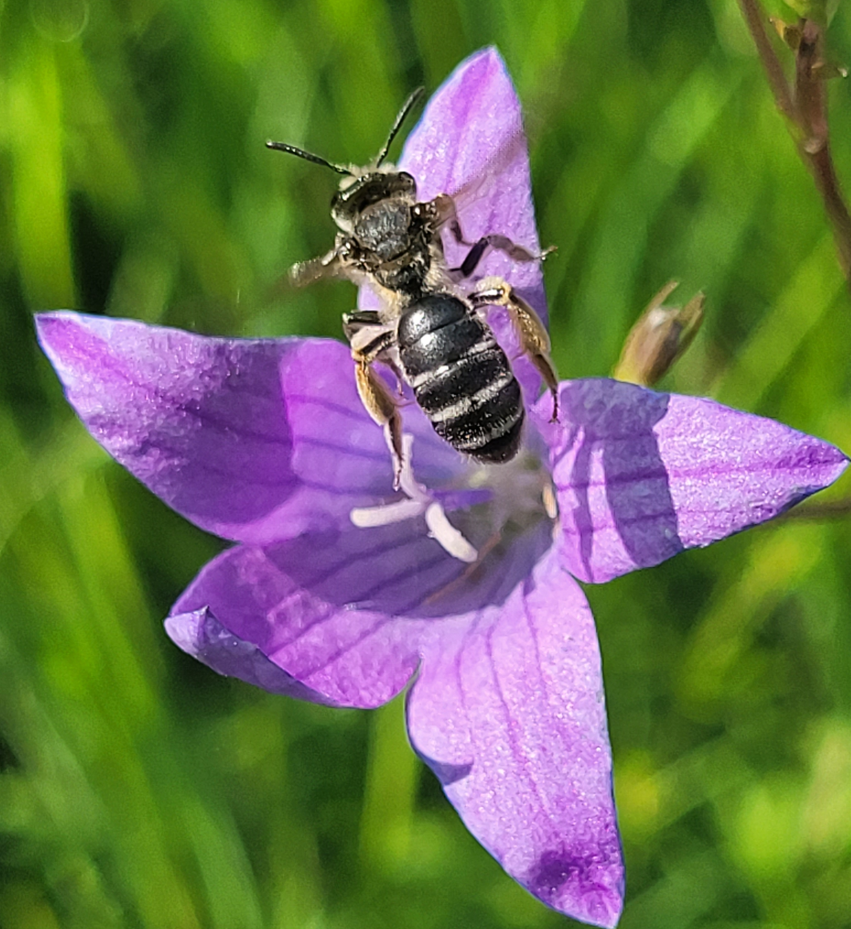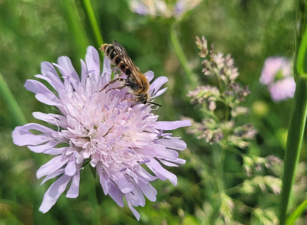 Kolejny dzień spędziłam częściowo w Arboretum z Elą, Gosią i Piotrem, gdzie mieliśmy okazję spotkać pszczolinkę zielonkawą (Andrena viridescens) i rożycę pospolitą (Ceratina cyanea), a częściowo na wałach nad rzeką i w żwirowni. Początkowo myślałam, że wały zostały obsiane łąką kwietną, ale od Piotra dowiedziałam się, że wcale nie – to naturalnie rosnąca roślinność, a te zbiorowiska utrzymują się tam od bardzo wielu lat. Jest tam pięknie – rosną dzwonki, świerzbnice, jaskry, koniczyny i wiele, wiele innych gatunków atrakcyjnych dla zapylaczy. Spotkałam pszczolinkę dzwonkową (Andrena curvungula) lub któryś z jej siostrzanych gatunków specjalizujących się w zbieraniu pokarmu z dzwonków. Był też smuklik szerokopasy (Halictus scabiosae) – to bardzo ciekawe, bo jak dotąd był notowany na zachodzie Polski, oraz w Krakowie. Do Krakowa najprawdopodobniej przybył właśnie przez Bramę Morawską, a więc w Raciborzu musiał być już wcześniej.