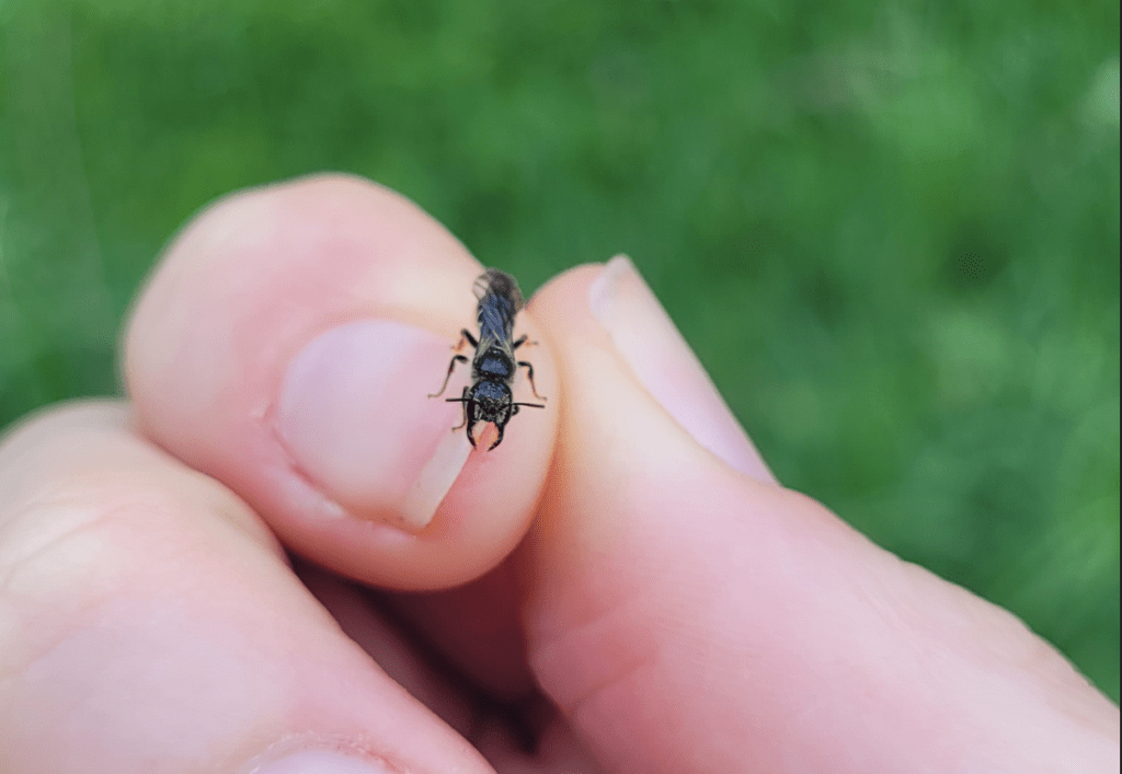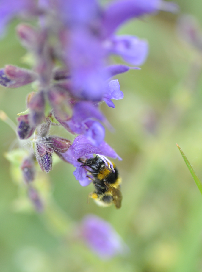 Praktycznie zaraz po wyjściu na łąkę moją uwagę zwróciła głośna, duża, czarna pszczoła zawisająca u kwiatów szałwii. Okazało się, że zaszczyciła mnie TA czarna pszczoła – zadrzechnia fioletowa. Nie mam ładnych zdjęć z tamtej obserwacji, ale jeśli chcecie pooglądać ten gatunek i o nim poczytać, to niedawno wysmarowałam cały długi post na ten temat 🙂
