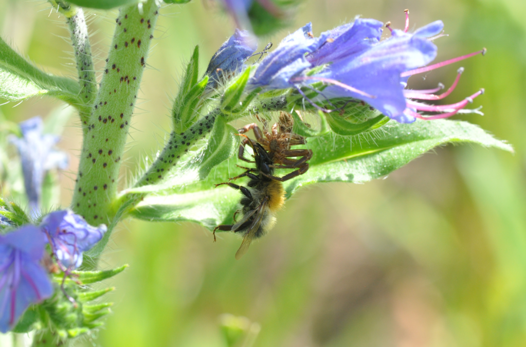 Życie trzmieli bywa niebezpieczne… Tutaj trzmiel rudy złapany przez czyhającego na żmijowcu pająka.