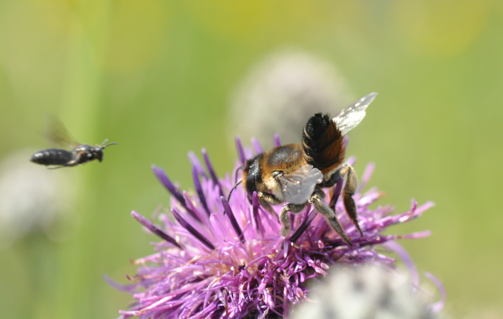 Spotkałam kilkoro starych znajomych, z którymi widziałam się w tych samych miejscach już w poprzednich latach. Na chabrach, których parę zaczęło już kwitnąć (sądząc po pąkach, wkrótce będzie więcej) uwijała się miesierka – jak sądzę, chabrówka (Megachile lagopoda). W tym samym miejscu ze dwa lata wcześniej widziałam samce tego gatunku, również na chabrach. Według źródeł gatunek ten nie jest wyspecjalizowany pokarmowo, a więc może korzystać z pyłku różnych roślin, ale ma wyraźną preferencję wobec astrowatych.