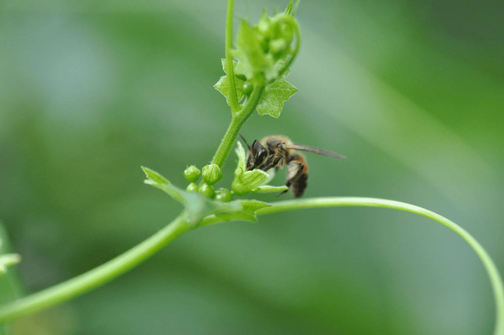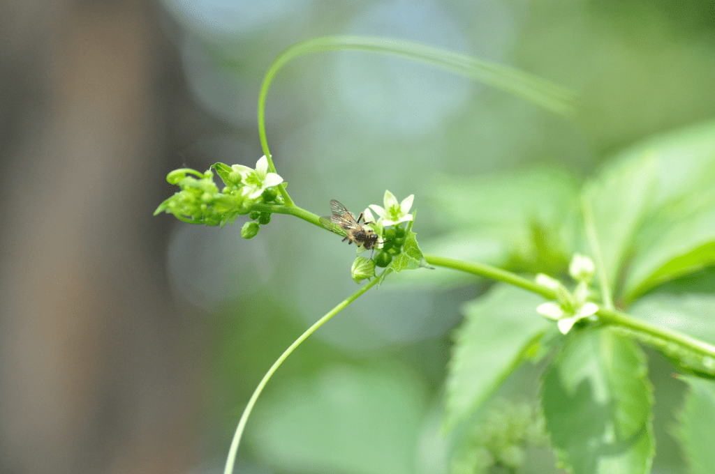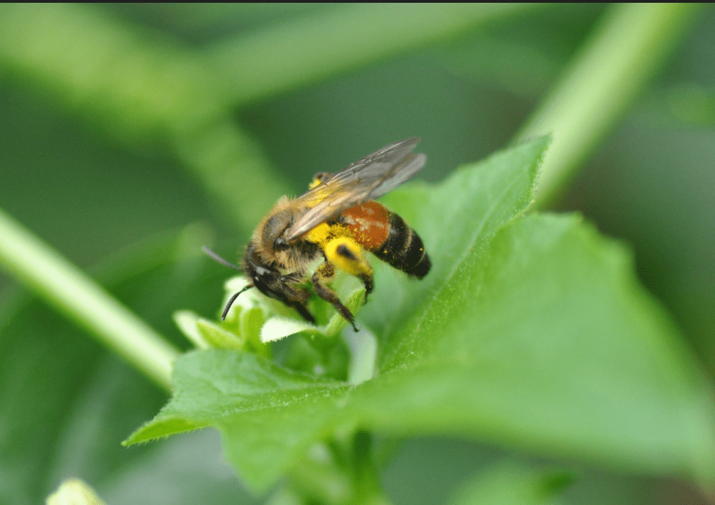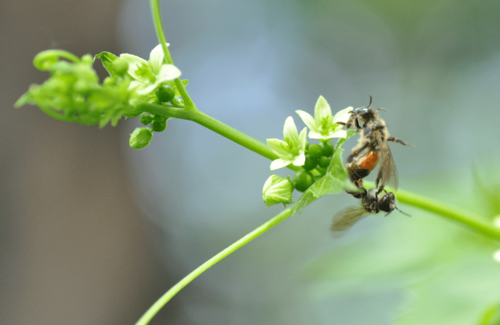 Parę dni temu udało mi się po raz pierwszy zaobserwować pszczolinkę przestępówkę (Andrena florea). To specjalistka pokarmowa na przestępie (Bryonia – ja obserwowałam ją na przestępie dwupiennym, Bryonia dioica). Średniej wielkości pszczoła, z czerwono zabarwionym odwłokiem (nie ona jedna tak ma, ale większość pszczolinek odwłoki ma pod włoskami ciemne). Po kilka pszczół jednocześnie latało nad kwitnącym pędem przestępu, który walczył o miejsce na płocie z winobluszczem. Nie wiem, jak taka mała ilość rośliny pokarmowej wystarcza pszczolinkom (tak jak mówiłam, to specjalistki, więc nie bardzo mają możliwość polecieć na inne kwitnące w pobliżu rośliny po pyłek), ale najwyraźniej jakoś sobie radzą.