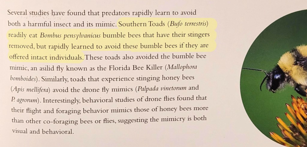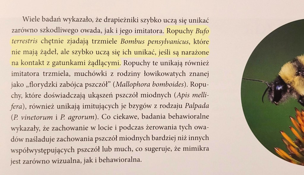 Trafiłam też na fragment, któremu tłumaczenie zmieniło sens. W oryginale – ropuchy były w ramach eksperymentu karmione trzmielami, którym usunięto żądła, a polska wersja w mojej ocenie sugeruje, jakoby trzmiele podawane ropuchom tych żądeł ze swojej natury nie posiadały. Ale oceńcie sami.