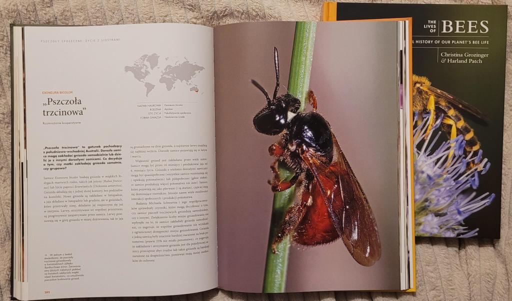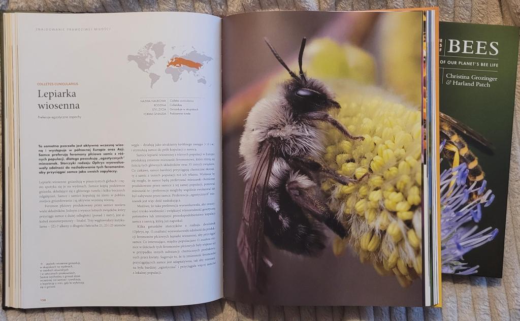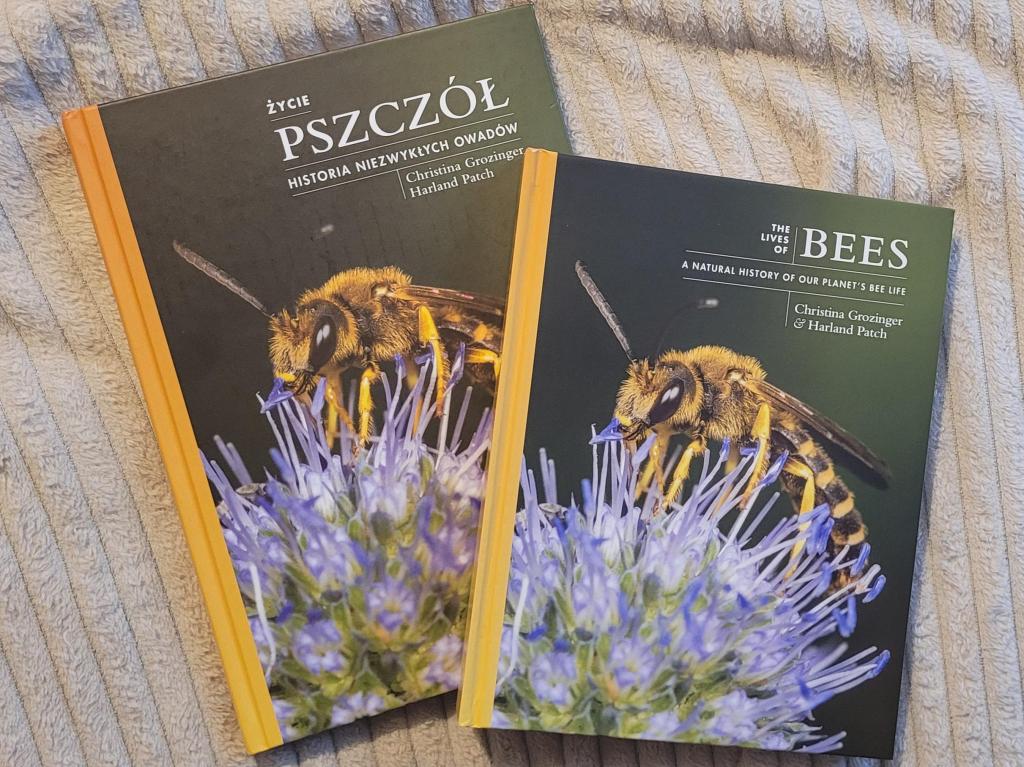 Książka „Życie pszczół. Historia niezwykłych owadów” Christiny Grozinger i Harlanda Patcha została wydana przez PWN i jest tłumaczeniem z angielskiego (tytuł oryginału to „The lives of bees. A natural history of our planet’s bee life”). Kupiłam jedną i drugą, żeby móc porównać tłumaczenie z oryginałem. I dobrze zrobiłam, bo mogłam sprawdzać genezę zauważonych błędów. Znalazłam zarówno takie, które były już w oryginale, jak i takie powstałe w tłumaczeniu. Ale zanim do nich przejdę, to parę słów o pierwszym wrażeniu, które było bardzo dobre. Obie książki są w formacie zbliżonym do A4, w porządnej, twardej oprawie. Polska wersja jest odrobinę większa i wydaje mi się, że ma też nieco lepszą jakość druku zdjęć. A tych w książce jest mnóstwo i są piękne. Jeśli lubicie albumy, to warto kupić „Życie pszczół” choćby i dla samych ilustracji.