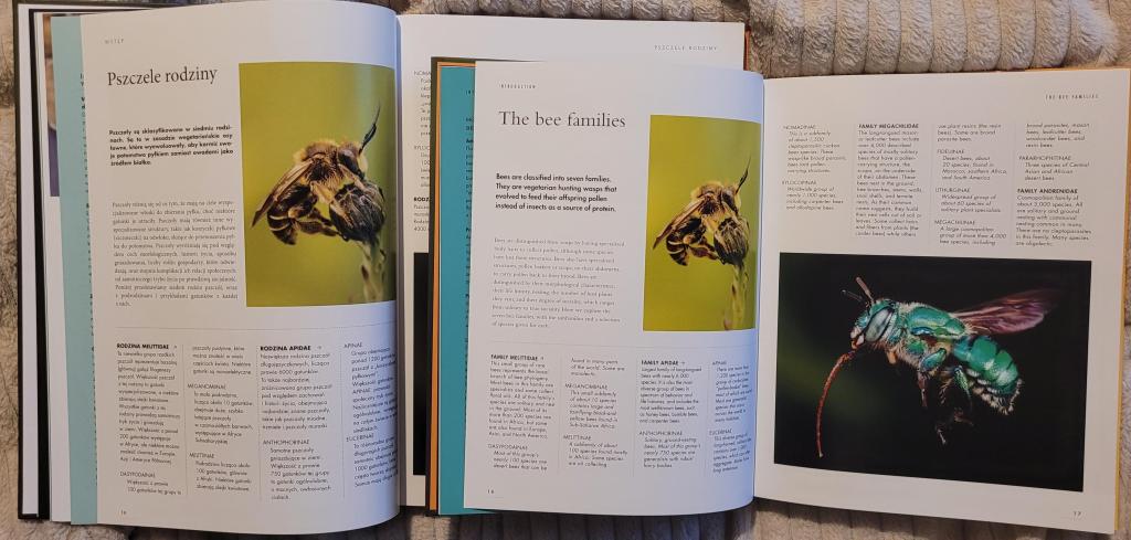 Treść też można pochwalić. Książka jest przekrojowa, opisuje chyba wszystkie najważniejsze zagadnienia z życia pszczół. Opisy ewolucji, biologii czy zagrożeń przeplatają się z portretami wybranych gatunków z całego świata. Widać, że autorzy wykonali wielką pracę, bo odwołują się do mnóstwa badań naukowych (choć zwykle nie cytują konkretnych artykułów – szkoda, bo wtedy można by było zajrzeć do źródła po więcej informacji, ale rozumiem, to w końcu nie książka naukowa, a popularnonaukowa). Duża część informacji pojawiających się w książce była mi oczywiście znana, ale dowiedziałam się z niej również nowych rzeczy, a pewne fragmenty zachęciły mnie do pogrzebania i zgłębienia tematu we własnym zakresie.
